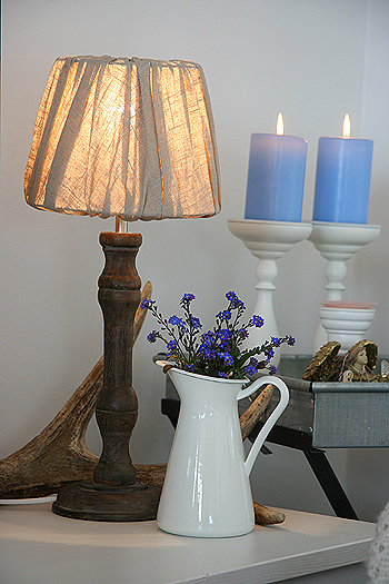 Jeg er svak for alle toner i fargen blå og falt pladask for dette sommerlige rommet. Jeg likte både den morsomme sofaen i lyseblått og hvitt samt det duse gulvteppet. Detaljer som kubbelys i fargen lyseblå på bordet inntil veggen ble et vakkert blikkfang. En hvit kurv satt på hodet, ble også en morsom løsning for bord! Det er inspirerende å se designere bruke gjenbruk i sine nyhets lanseringer av tekstiler og møbler. Gjenbruk er morsomt! Kombinasjon av ulike møbler og forskjellige typer tekstiler og mønster ble en personlig og frisk stilmix jeg likte godt. Bildet kommer fra den nye katalogen til DesignersGuild. En super nettside med fullt av vakre og inspirerende bilder å drømme seg bort i.