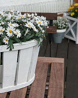 Jeg er svak for hvite trekasser og denne hvite ovale trekassen fant jeg i fjor på Himmelrommet. Ulike varianter av hvite trekasser med forskjellig form og størrelse finnes i de fleste hagesenter, interiørbutikker og på nett. Eneste utfordring med min trekasse var at det er stor avstand mellom trebordene og man ser rett inn på planten. Min løsning ble at jeg hos Hageland fant en smart hvit plastpotte som kan brukes til alt fra salat til blomster og finnes i ulike former og farger. De har et utrolig utvalg av potter, dekor og gamle og nye stauder for deg som er på jakt etter nostalgiske planter til hagen eller terrassen. Nå er snart terrassen klar for 17. mai! De supersøte margerittene ble flotte i den gamle trekassen og da mangler bare 17. mai flaggene:-)